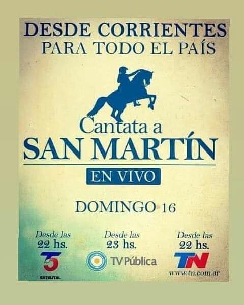 Desde Corrientes, a todo el país, se emitirá la Cantata a San Martín, en vispera de la conmemoración de su fallecimiento, el domingo 16, en directo desde las 22hs, por T5 Satelital y TN y en diferido, a las 23 hs. por la TV Pública.