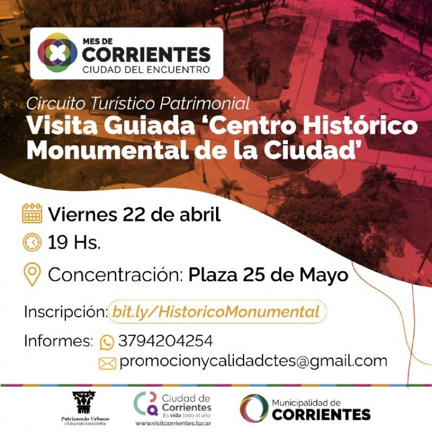Continuando con las diferentes propuestas culturales y recreativas que desarrolla la Municipalidad capitalina para celebrar el Mes de Corrientes, esta semana habrá tres paseos guiados para que vecinos y turistas conozcan diferentes espacios de la ciudad que forman parte del circuito turístico patrimonial. El viernes habrá un recorrido por el centro histórico.