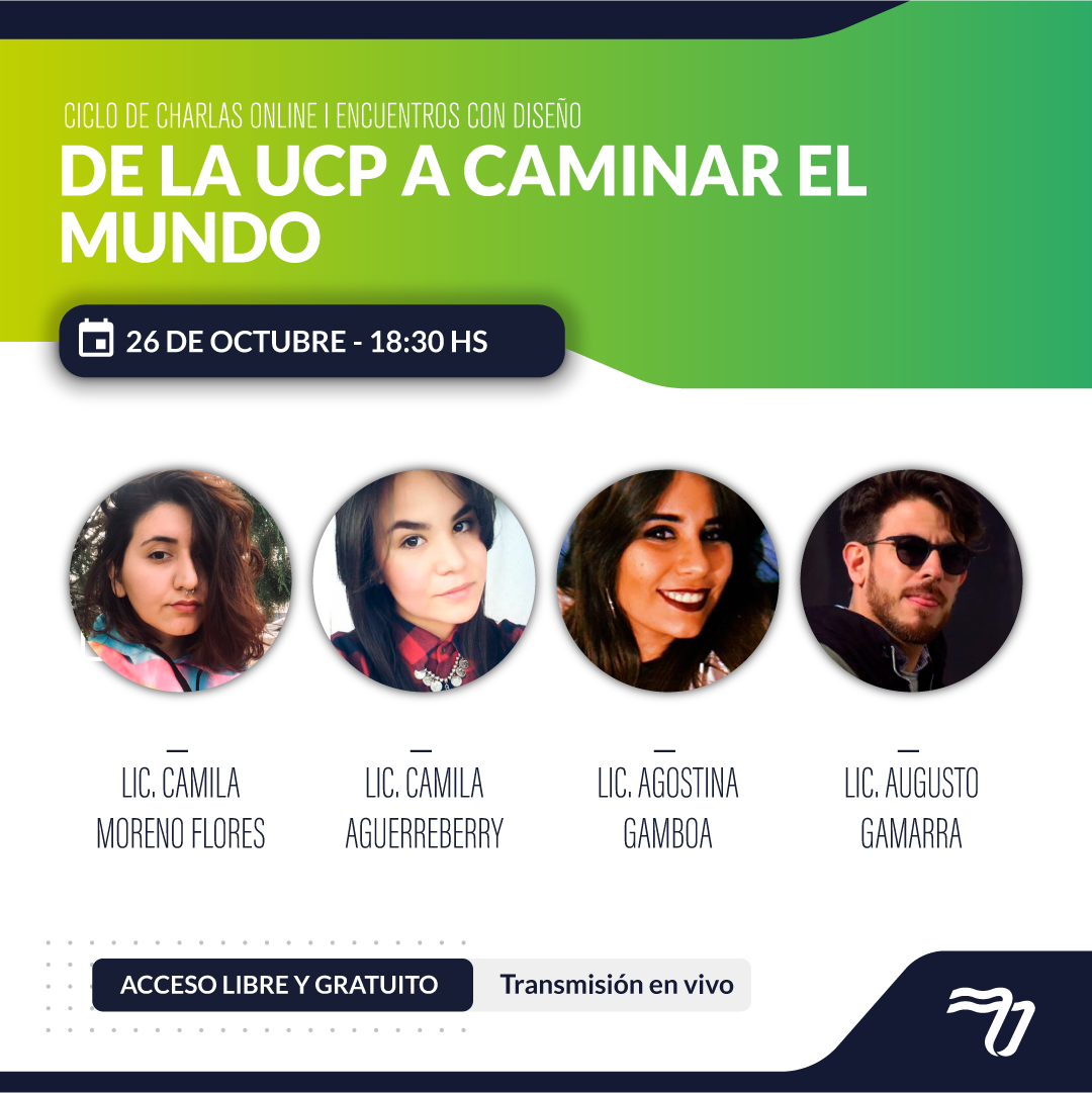 Próximo encuentro 26 de octubre “De la UCP a caminar el mundo” a cargo de la Lic. Camila Moreno Flores y Lic. Camila Aguerreberri de @Malica Estudio, Lic. Agostina Gamboa de @Carajo y Lic. Augusto Gamarra