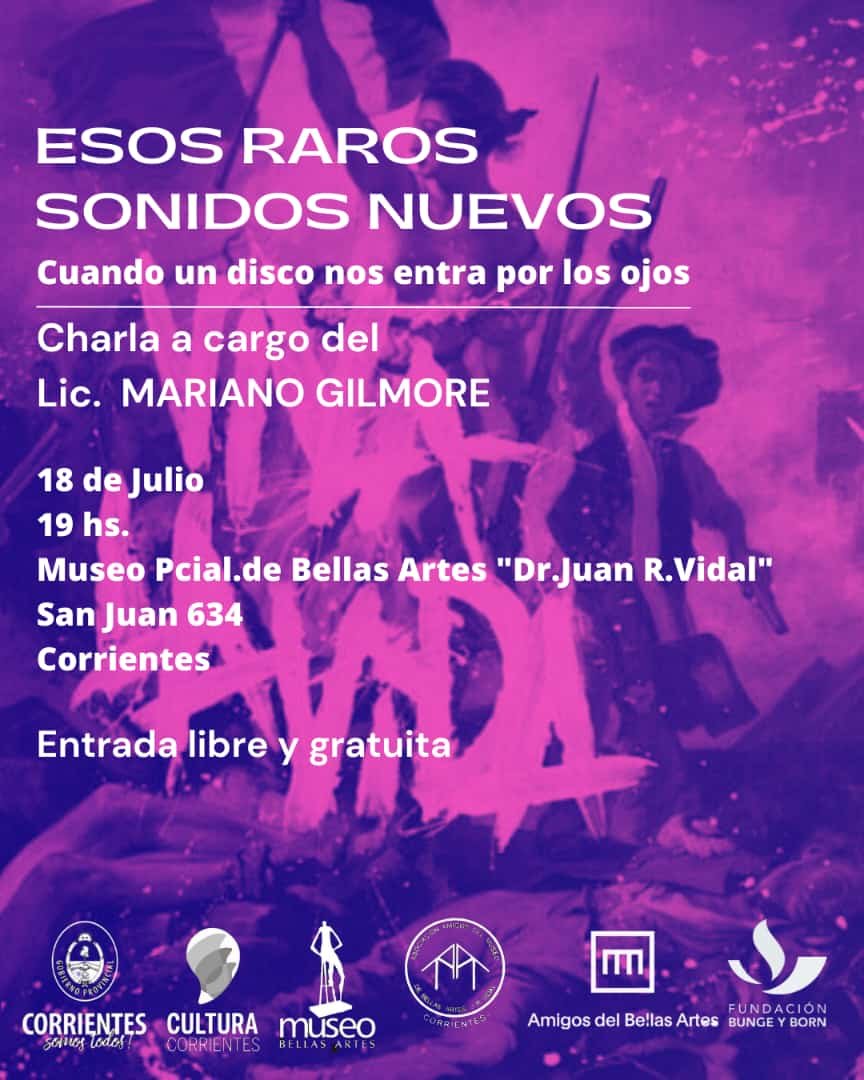 En el contexto de este programa, el Instituto de Cultura de Corrientes y el Museo de Bellas Artes invitan a la charla “Esos raros sonidos nuevos…Cuando un disco nos entra por los ojos” que ofrecerá el Lic. Mariano Gilmore el martes 18 de julio, a las 19 hs., con entrada libre y gratuita.