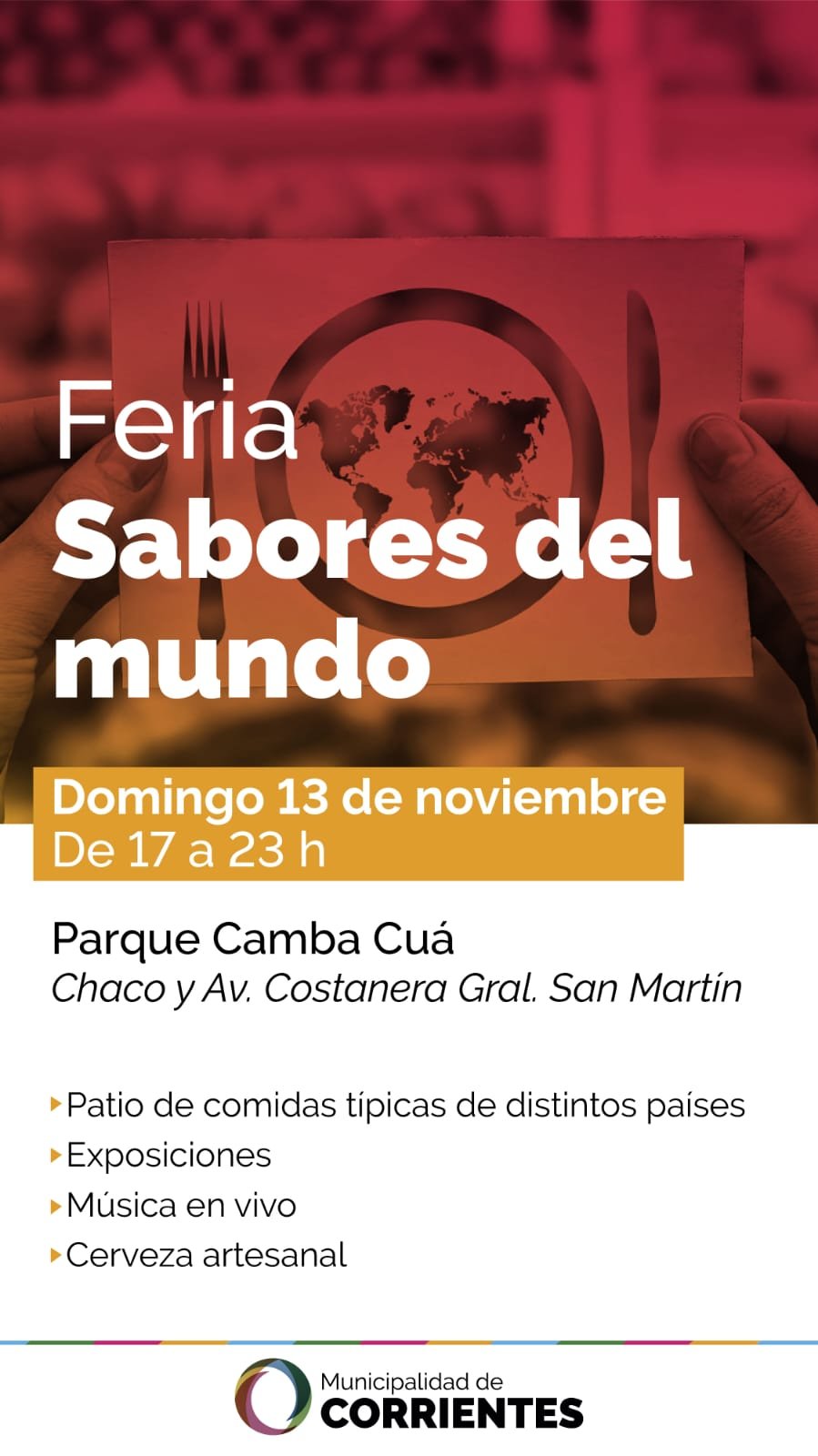 Feria Sabores del Mundo Domingo 13 Noviembre 17hs a 22hs Parque Camba Cua Patio de comidas de diferentes paises Exposiciones Musica en vivo Cerveza artesanal