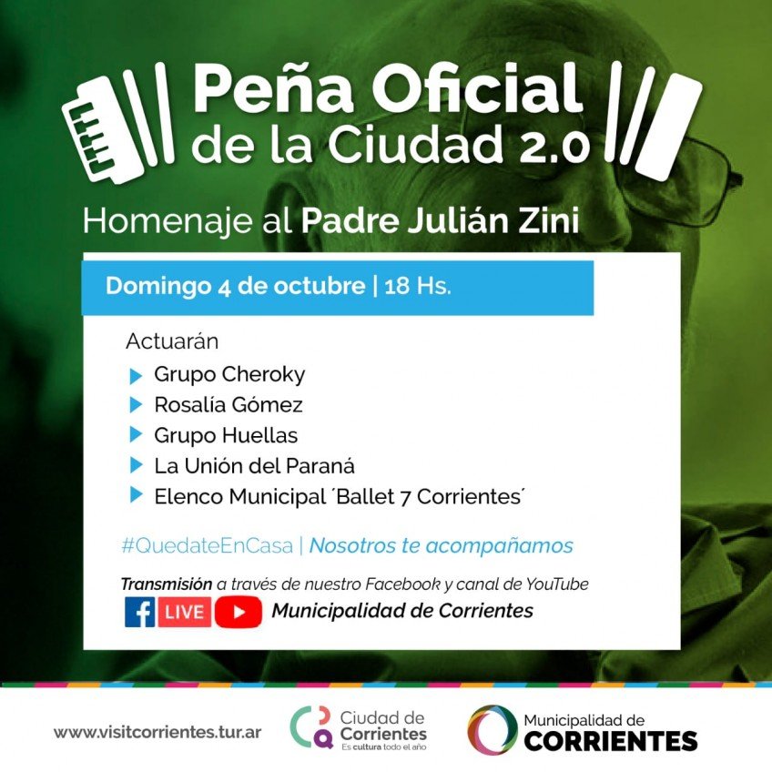 Este domingo la Municipalidad de Corrientes renueva su oferta musical chamamecera a través de la Peña Oficial de la Ciudad 2.0. Desde las 18, por las redes sociales oficiales el público podrá disfrutar de un nuevo espectáculo de música litoraleña con un homenaje al padre Julián Zini, que hace poco más de un mes partió de esta tierra y el pasado 29 de septiembre hubiera cumplido 81 años.