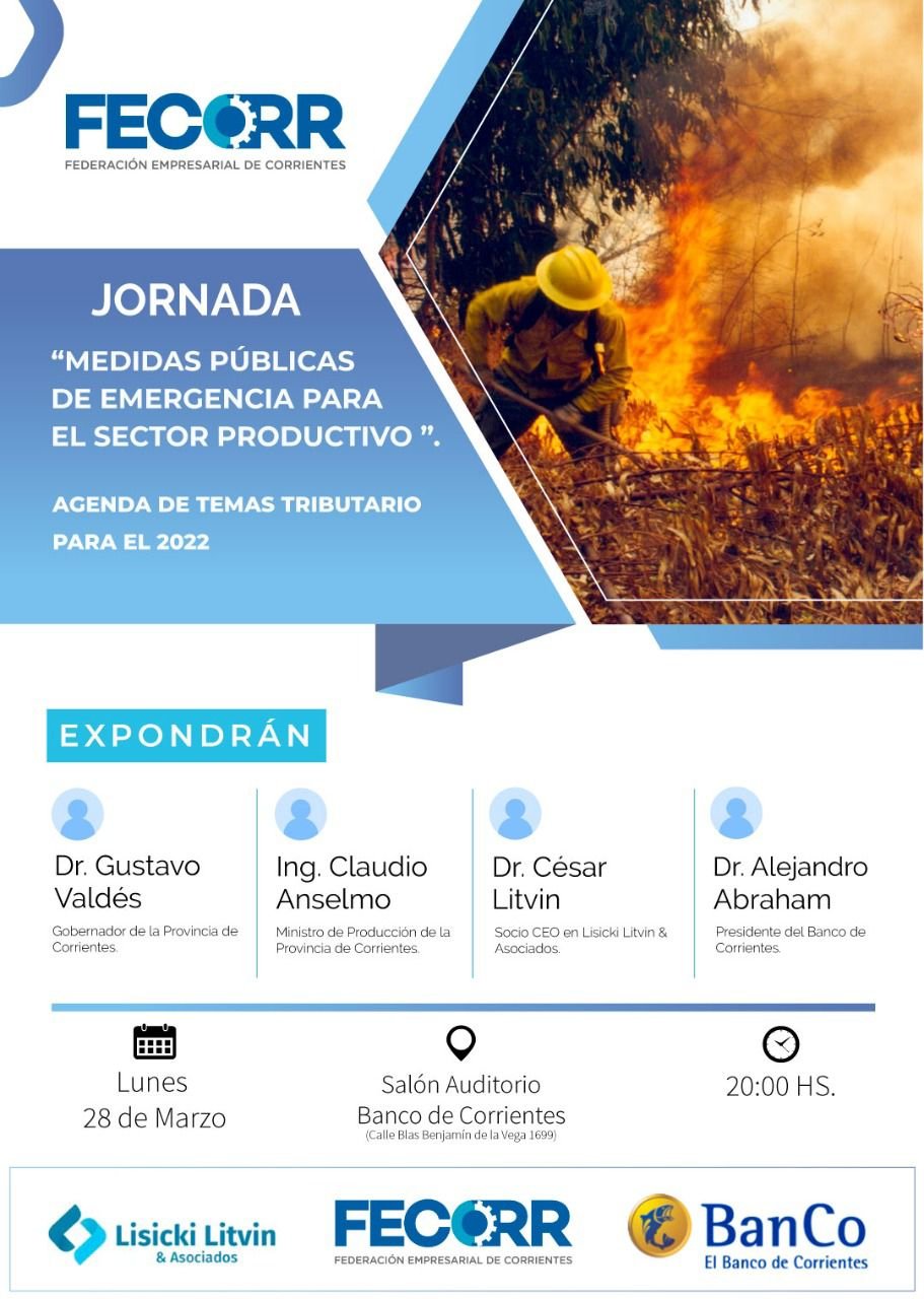 La Federación Empresarial de Corrientes (FECORR) y el Banco de Corrientes invitan a la jornada “Medidas públicas de emergencia para el sector productivo” que se realizará hoy lunes 28 de marzo a las 20 hs en el Salón Auditorio del Banco de Corrientes (calle Blas Benjamín de la Vega 1.699).