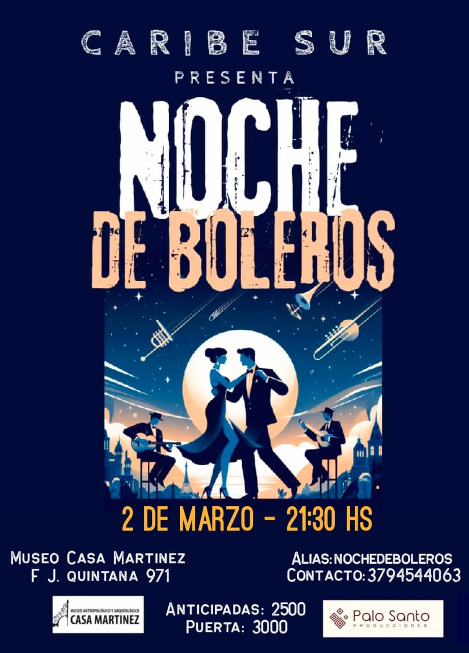 El Instituto de Cultura de Corrientes invita a una gala especial de bolero que se realizará el sábado 2 de marzo, desde las 21,30, en el Museo Arqueológico y Antropológico, ex Casa Martínez, ubicado en Quintana 971. Este espectáculo se realizará en el marco del Mes de la Mujer, con Caribe Sur como protagonista junto a la participación destacada de Sylvina Casco, Mili Esquivel, Débora Velozo y Emma Otero.