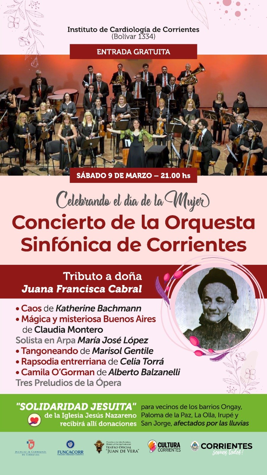 El Instituto de Cultura de Corrientes invita al concierto que la Orquesta Sinfónica de la Provincia, dirigido por la maestra Andrea Fusco, brindará este sábado 9 de marzo, a las 21 horas, en el Instituto de Cardiología de la ciudad de Corrientes. Dicho espectáculo, con entrada libre y gratuita, será en homenaje a las mujeres en su día. Además se aprovechará la ocasión para recibir donaciones para los afectados por las lluvias.