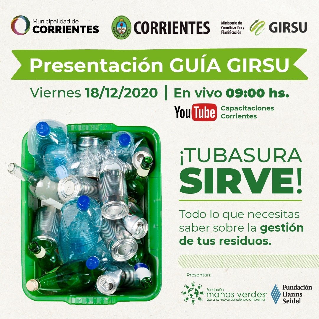 Bajo el lema “Tu basura sirve – ayudános a convertir los residuos en recursos” se presentará este viernes, el 18 de diciembre a las 9 hs en la Ciudad de Corrientes la guía de Gestión integral de los Residuos Sólidos Urbanos (GIRSU), una herramienta informativa para orientar a los vecinos sobre el circuito de gestión integral de los residuos en la ciudad y los diferentes tipos de residuos.