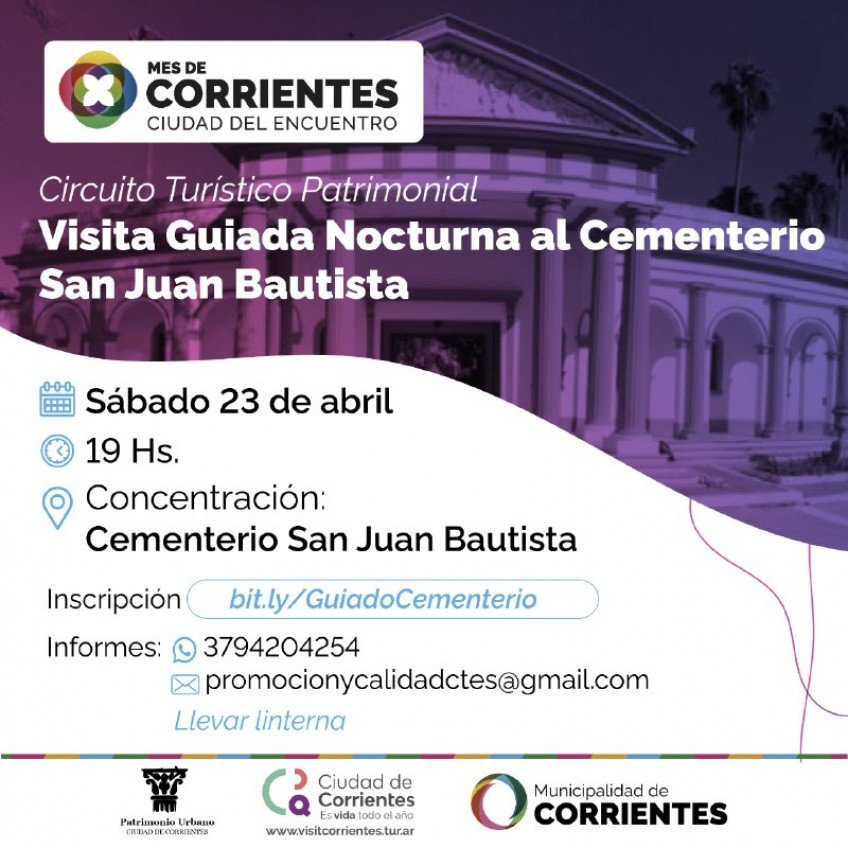 Las propuestas se enmarcan en las actividades por el Mes de Corrientes. Habrá visita guiada nocturna al cementerio San Juan Bautista, recorrido por el centro histórico y monumentos